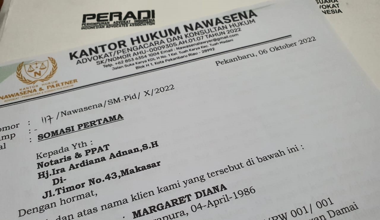 Pekanbaru — Kuasa hukum dokter Margaret Diana melayangkan somasi terhadap Notaris Hj. Ira Ardiana Adnan, S.H., yang berkedudukan di Makassar, sehubungan dengan adanya dugaan tindak pidana penipuan dan penggelapan terhadap sertifikat rumah. “Bahwa dokter Margaret Diana telah melunasi kewajibannya untuk melakukan proses balik nama sertifikat rumah yang beralamat di Jalan …